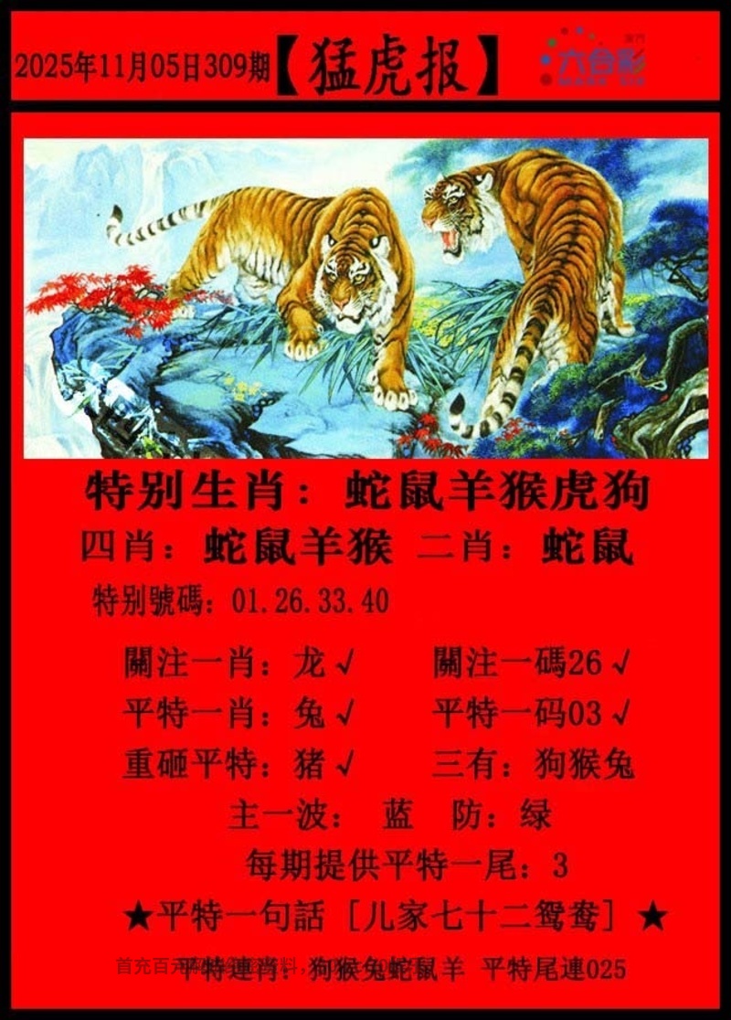| 305期 | 鼠羊虎蛇龙狗猴 | 开:鼠42中 |